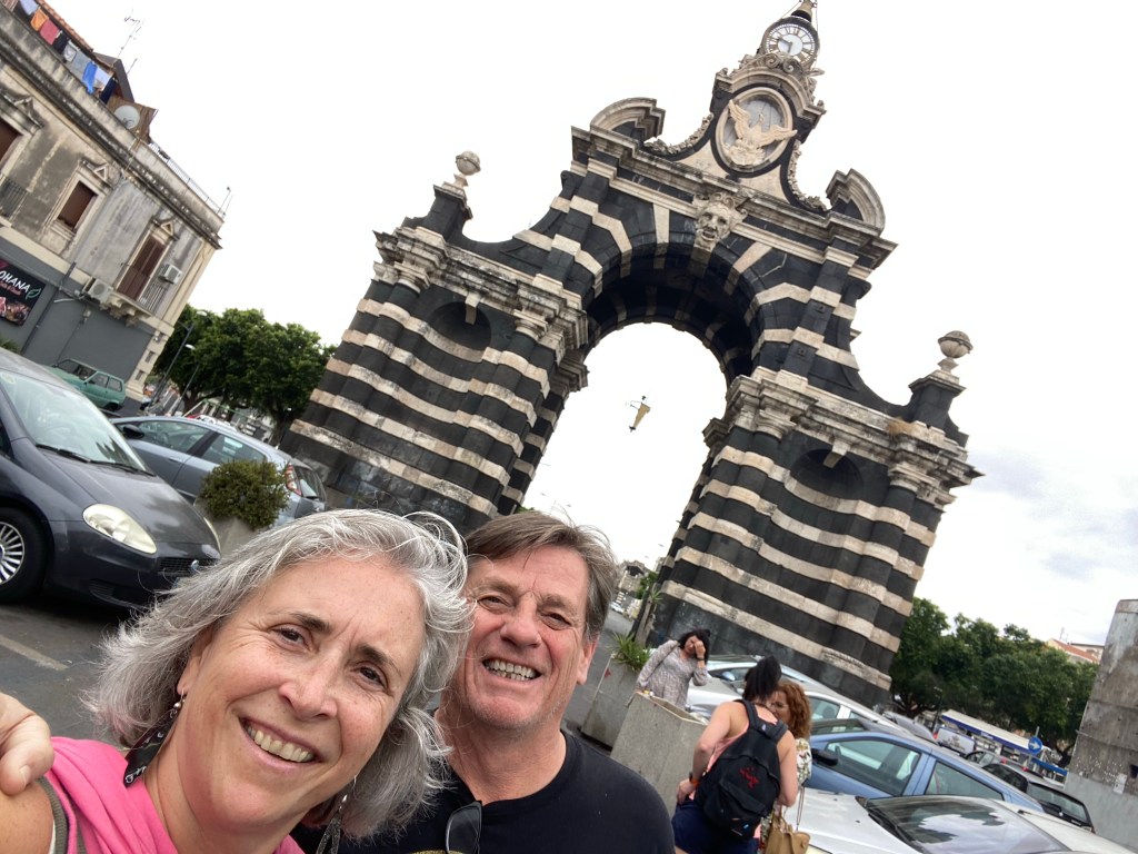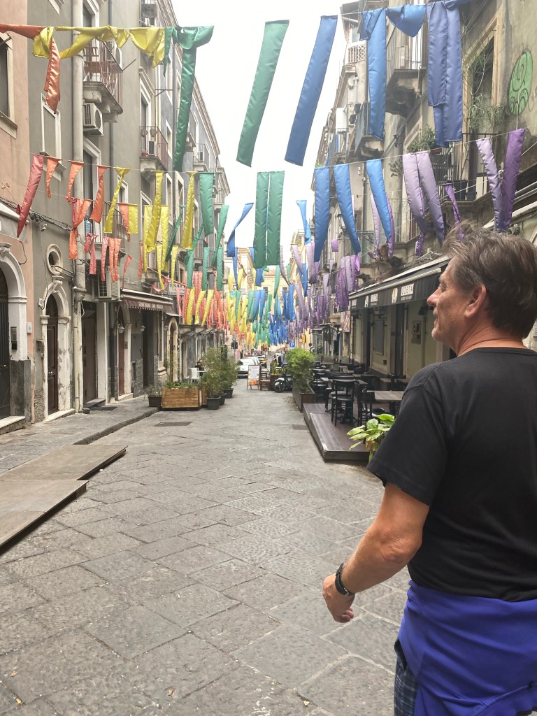 We arrive at the Piazza Duomo and cathedral Sant-Agatha with its famous black elephant statut (made of lava stone) and beautiful fountain. We walk to the Porta Garibaldi via a street that is fairly rundown area. Lots of small businesses seem to be closed unfortunately.