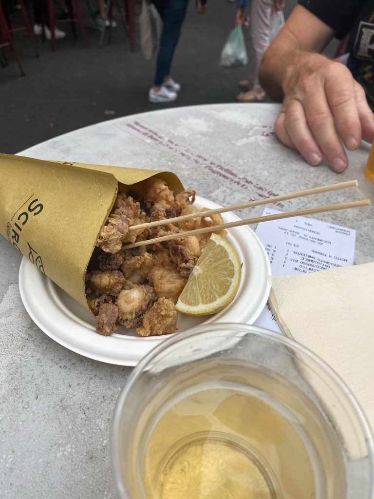 On our way back we stop at the Scirrocco fish bar in a small alley where everything seems to be fried. We order the specialty – a cone of fried pieces of fish and a drink. What a treat!! Chuck didn’t like the fried sardines so we will have to try again.