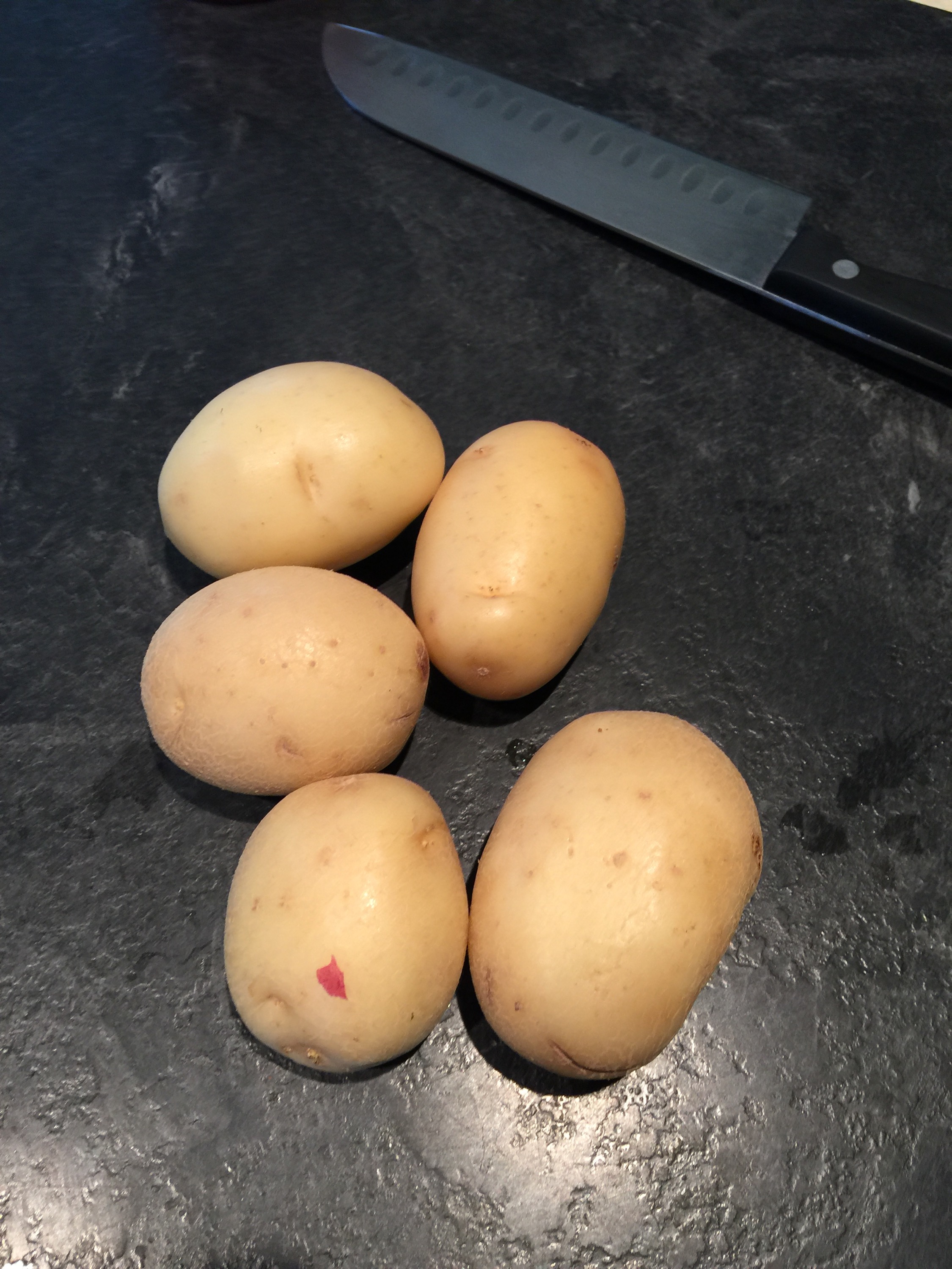- I used 5 Yukon gold mini potatoes cut in half but you can use larger ones and cut them into wedges.