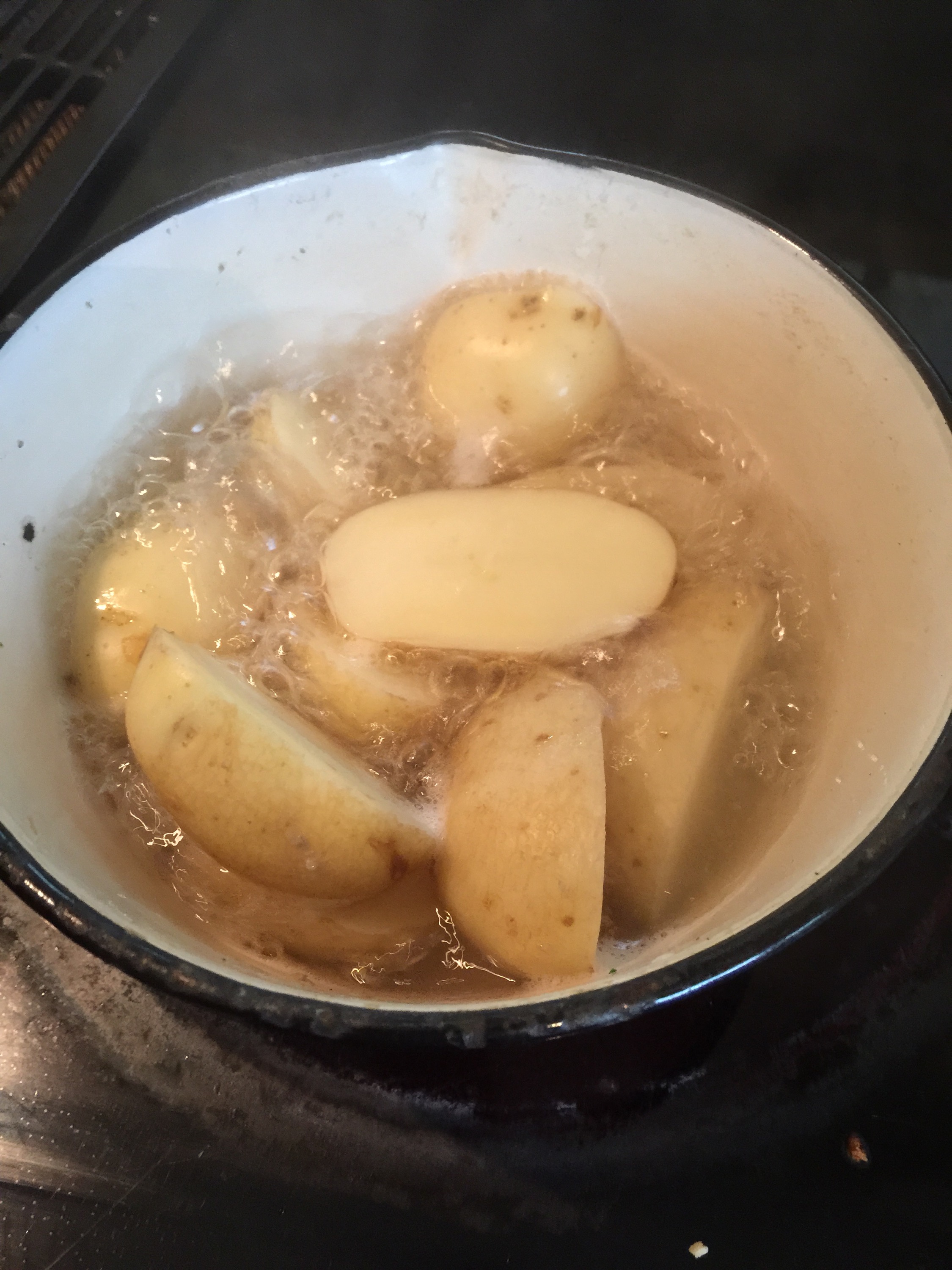 Cut potatoes in half and place them in a saucepan with 2 inches of water. Bring to boil and then reduce to simmer for 10 minutes. Drain and put them back in the saucepan to coat them (my husband appreciate it when I re-use, less dishes :).