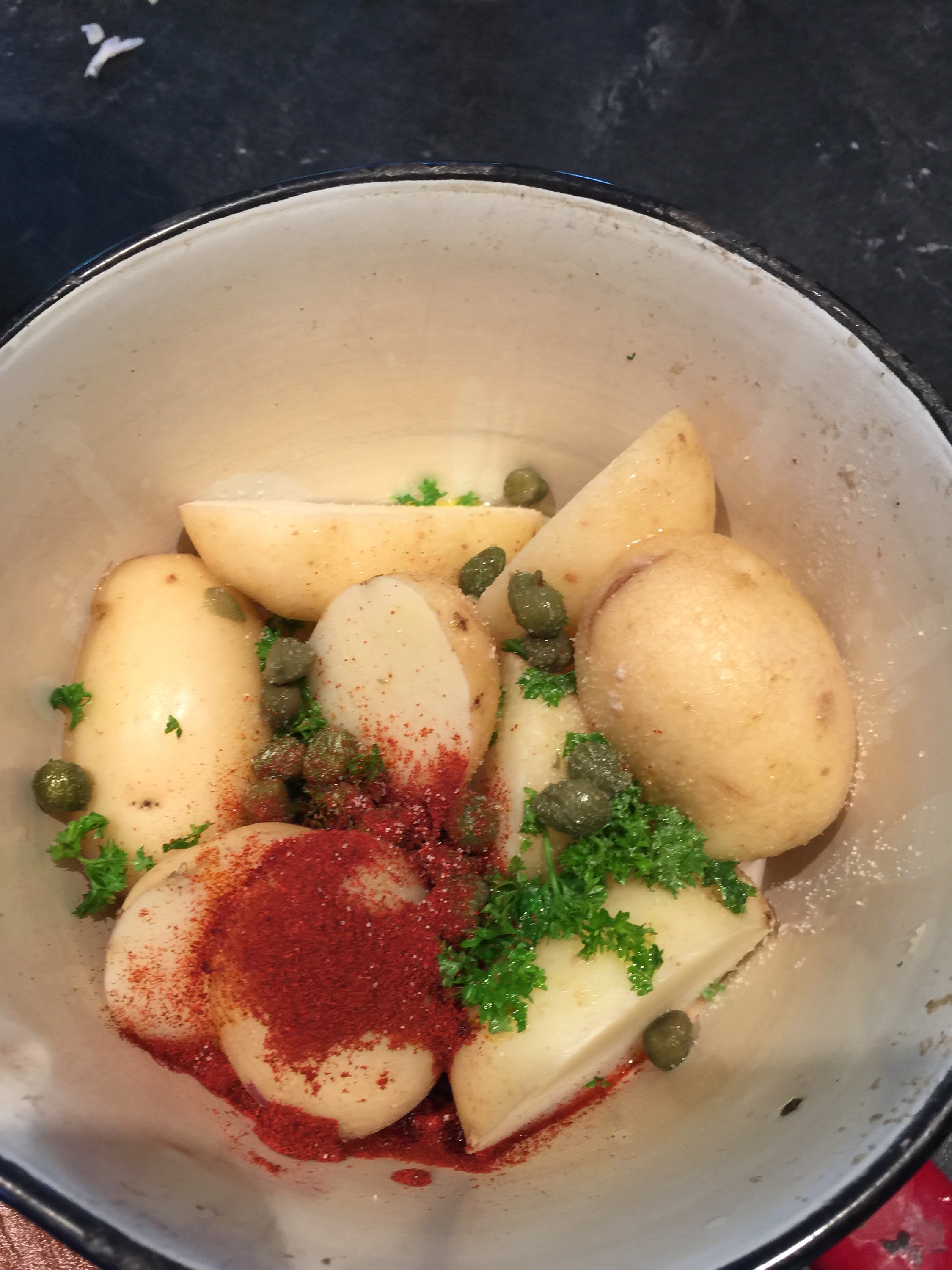 Add 1 tbsp of chopped parsley, the capers, 1-2 tsp oil, paprika and half the salt. Toss gently to coat them.