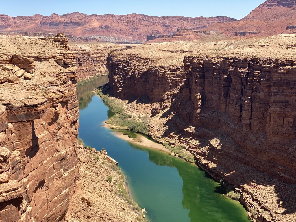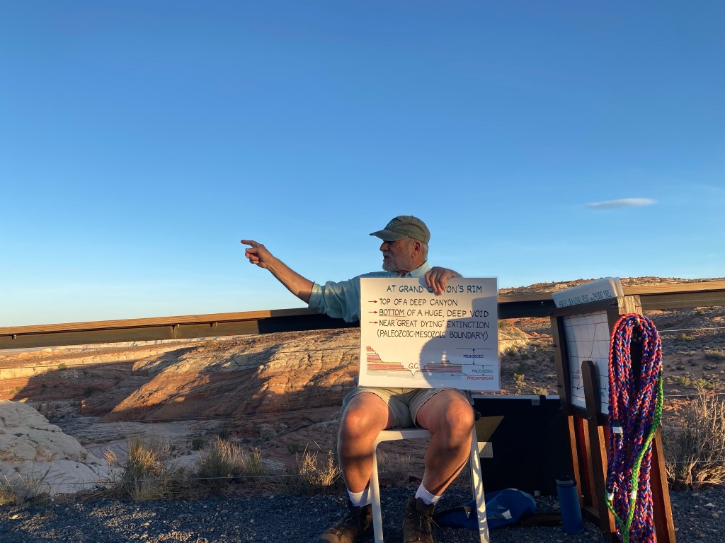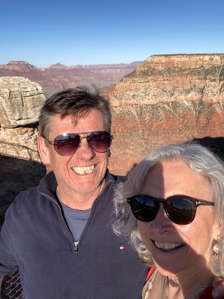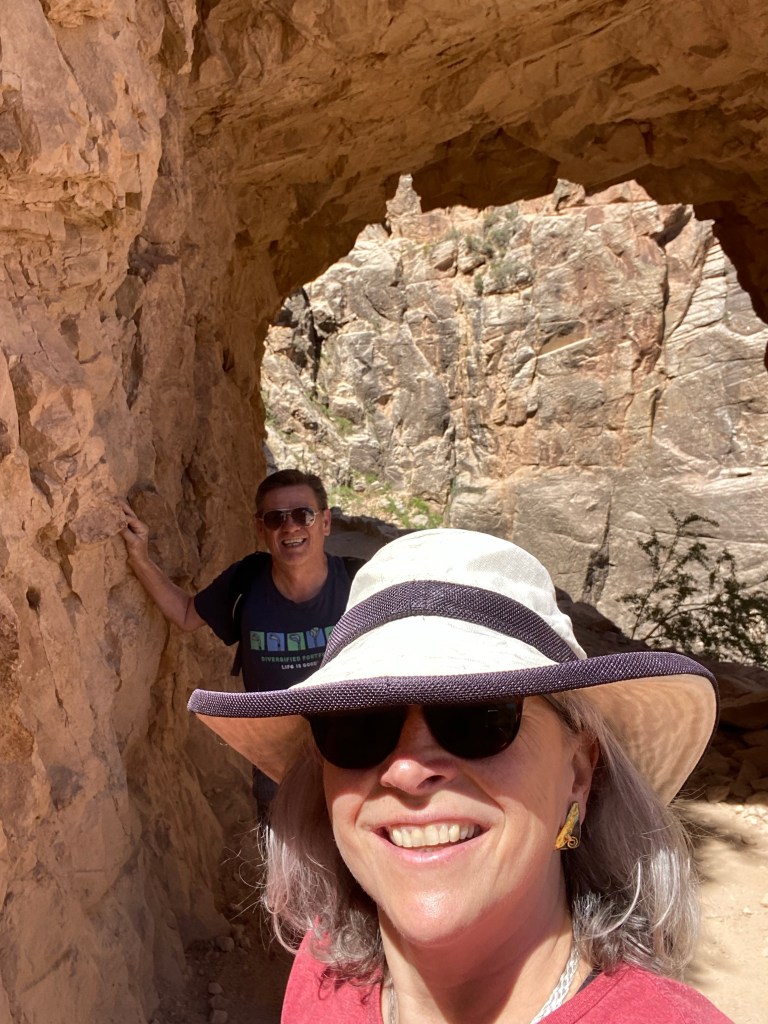 The Under the Canvas luxury tent campground is exactly as we would have expected! The interior of the tent is spacious and well appointed and our view to the Grand Staircase from our porch is fabulous. The dining hall with its outdoor patio is also lovely. We go for a short hike on the property to their small slot canyon and enjoy a very informative talk from geologist Gary in the evening. He shares so much information about the “making” of the Grand Canyon but also shares about the water crisis they are currently experiencing. From an average of 6 inches of water a year, they were down to under 1 inch last year. Their local lake Powell created by the dam is down to 27% of its historique high, threatening their very water supply and the whole Colorado river water level. Astonishing that not much is being done to address this overconsumption of water.