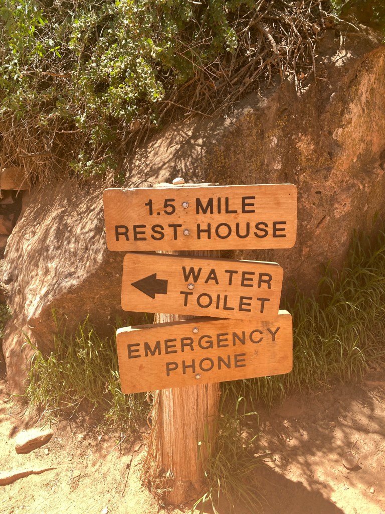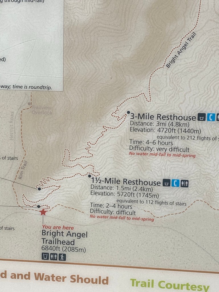 After restocking in water, we make our way to Bright Angel trail head and start the descent. We are warned that it takes an hour to get to the 1.5 mile resthouse and 2 hours to go back and that it is steep all the way but it gets very steep at certain points. We resolve to take our time and make it there.