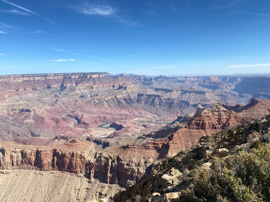 First we stop at a scenic overlook called Liban Point, just west of Navajo Point. What a view! This is our favorite view of the Grand Canyon – we can see a large section of the Colorado river as well as the famous rapids that drop 3 buildings! Luckily, there is a gate for Chuck 🤣 Pictures again do not do it justice but here we go.
