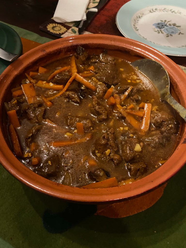 Remove from the pan then add carrots, onions, ginger and garlic and cook for 5 minutes. Return the lamb to the tagine and add lemon juice and zest, chicken broth, tomate paste and honey.