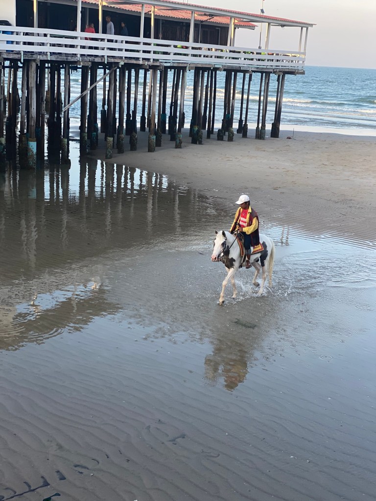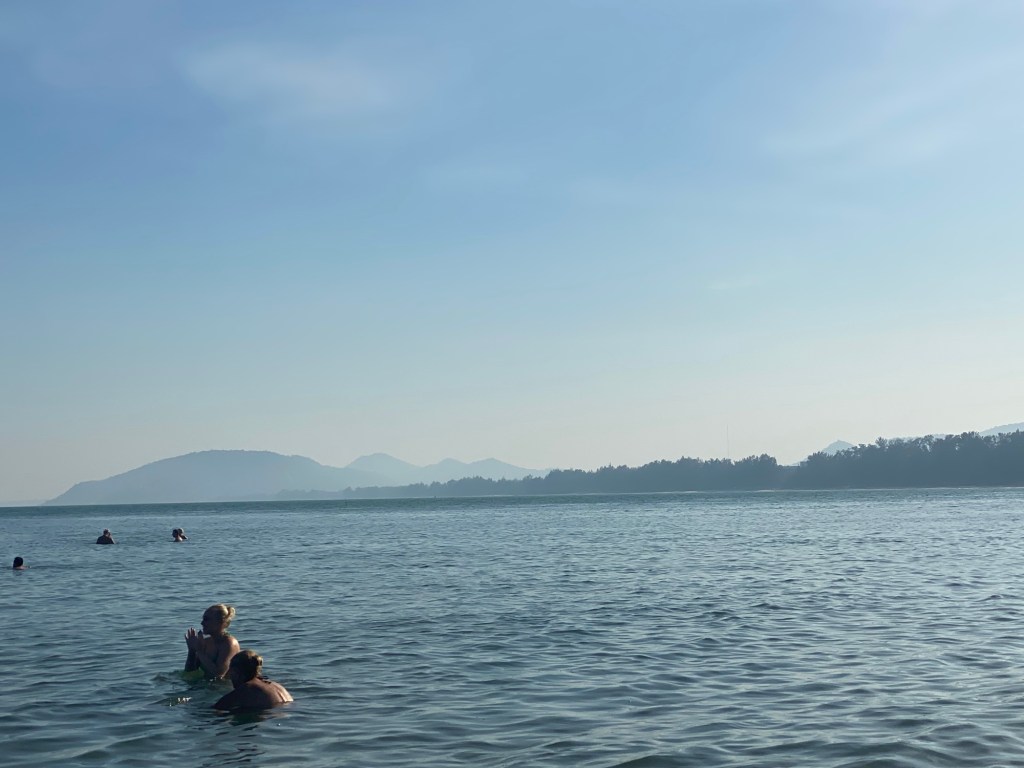 We go for a Thai massage near the Hilton and stop at a restaurant on the water. On the beach, a few stray dogs are playing in the water and one of the horse for hire is stretching its legs.