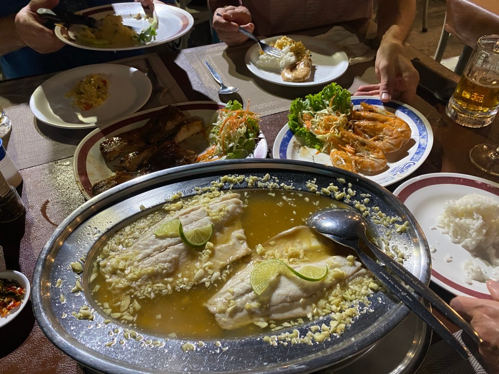 In the evening we go to the “best” seafood restaurant in town called Chaolay Seafood, overlooking the ocean and I order my first grilled sea bass