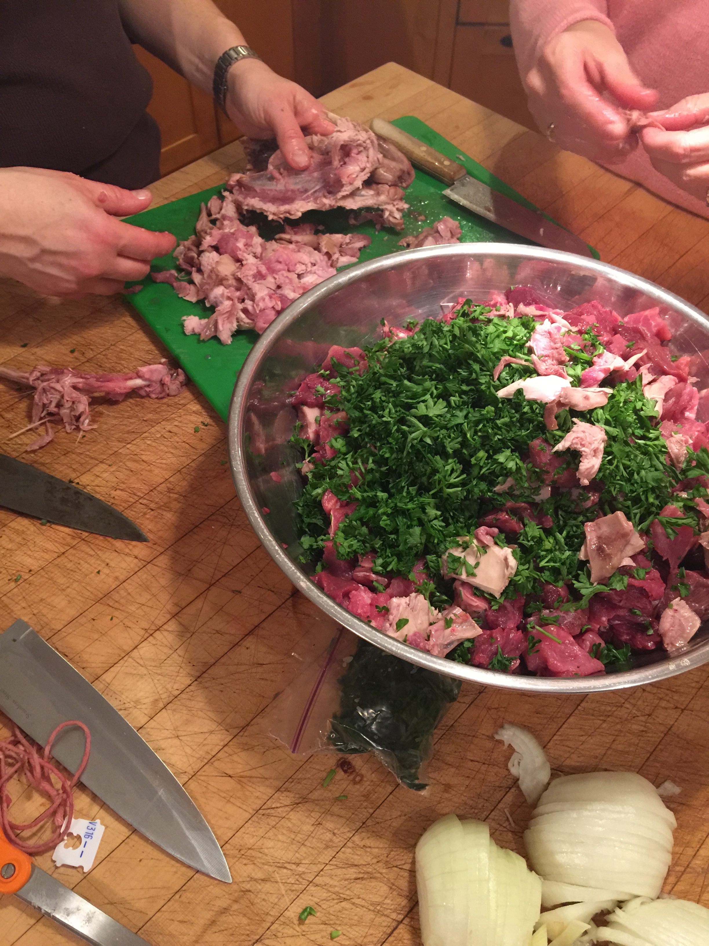Last night my sister Anne-Marie came to make the pastry (her specialty) and my friend Alicia brought the moose and a grouse (what the heck, throw it in!!). I went to our local Angus Beef market who carries the best variety of wild game and bought some wild boar (instead of the hare), venison and elk. Mark (the fantastic owner) and I settled on wild boar bacon for the bottom of the pie to replace the pig skin.