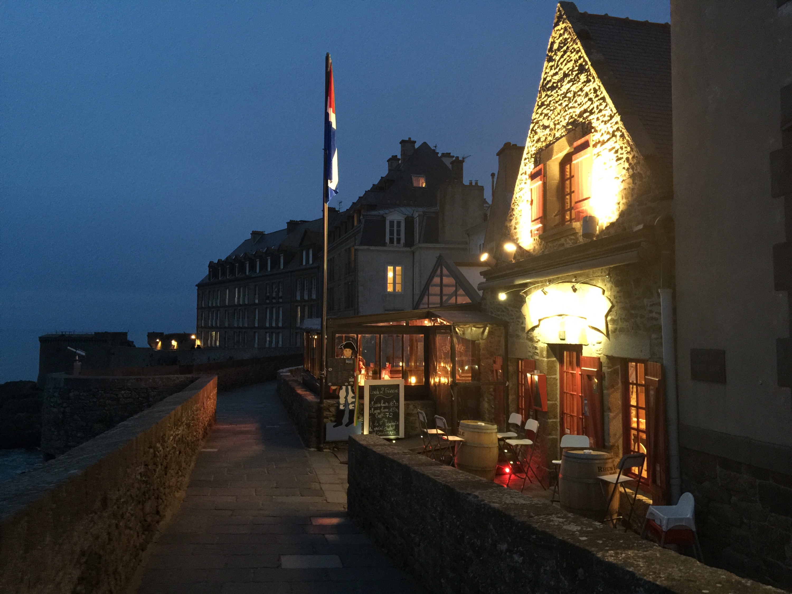 It is now 3:30 and all the restaurants are closed for their break. Our lunch has to wait. Off for Saint-Malo. We find our nice hotel and a very helpful receptionist who shows us the rooms, lounge and dining area for this summer. Excellent! She then phones my appointment to reschedule a few and after doing some business we head off for Intra-Muro (la vieille ville). We stop at the tourism office and get fabulous help for my summer activities. Wouldn’t you know, we are here for the “Chandeleur”. The Festival de crèpes!! Yay!! We set out to walk the top of the wall.