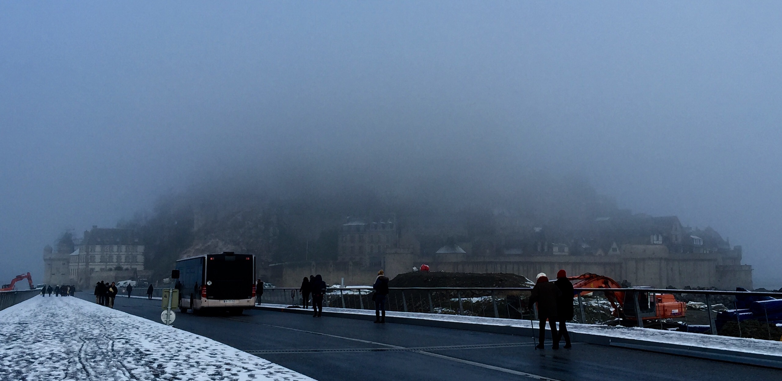 Then we are off to Normandie to check out the inn by way of Mont-St-Michel. On our way, we encounter a bit more snow and then a thick fog envelops the car. As we arrive to Mont St-Michel, we are still hopeful as we wait for the shuttle to take us at the foot of the Mont. This place has changed significantly since my last visit in 2007. No longer can we park close to the Mont and walk on the Passerelle. To protect the erosion, we now park quite a distance away and have to shuttle over through hotels and restaurants. The whole thing has taken a commercial air that I am not sure I enjoy. At the foot of the Landmark, we have no luck. We can barely see the first row of houses. We take a picture anyways and hop back on the shuttle to go back to the car.