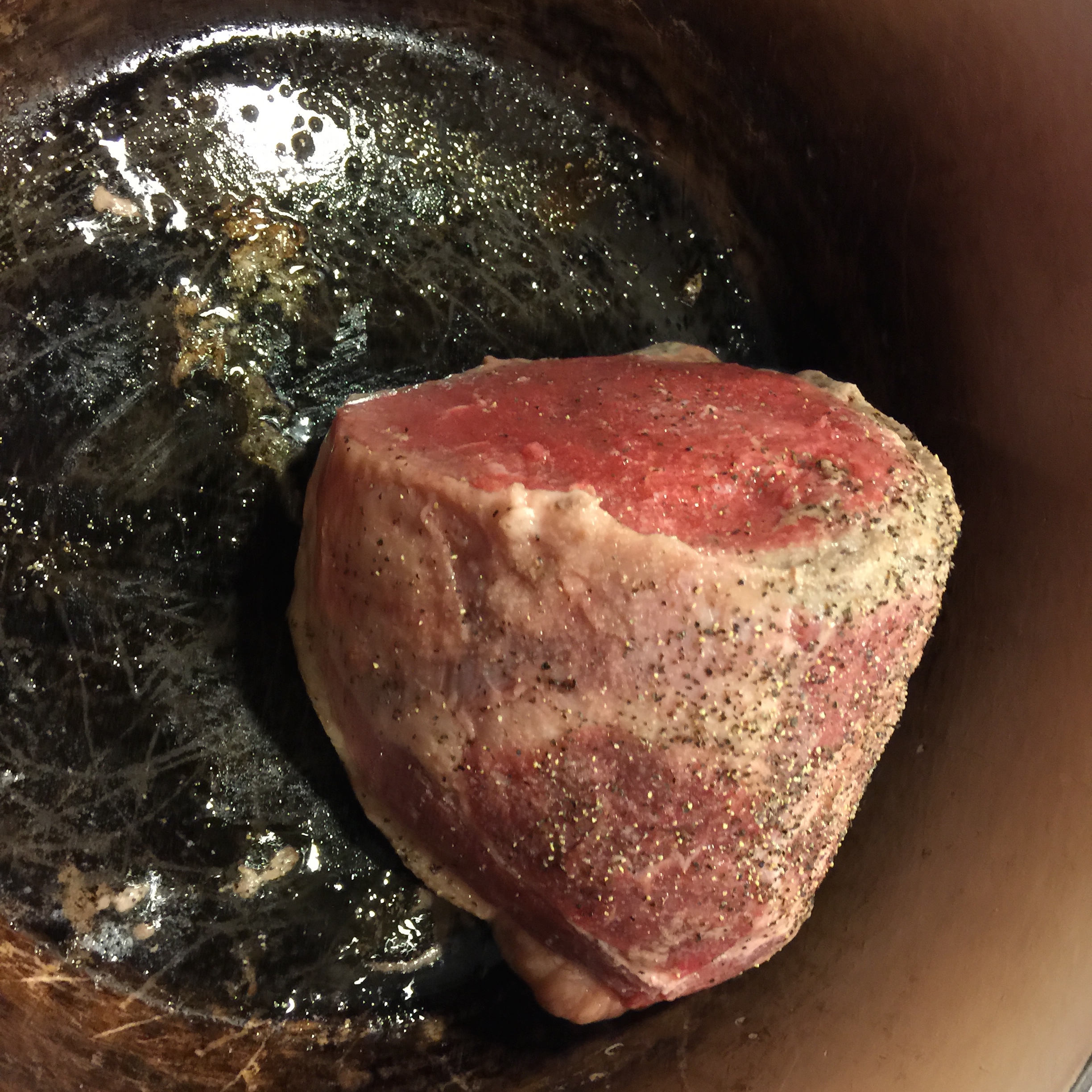 Heat the oil in the dutch oven and brown the roast on all side. Sprinkle with salt and pepper. Remove it from the pot and set aside.