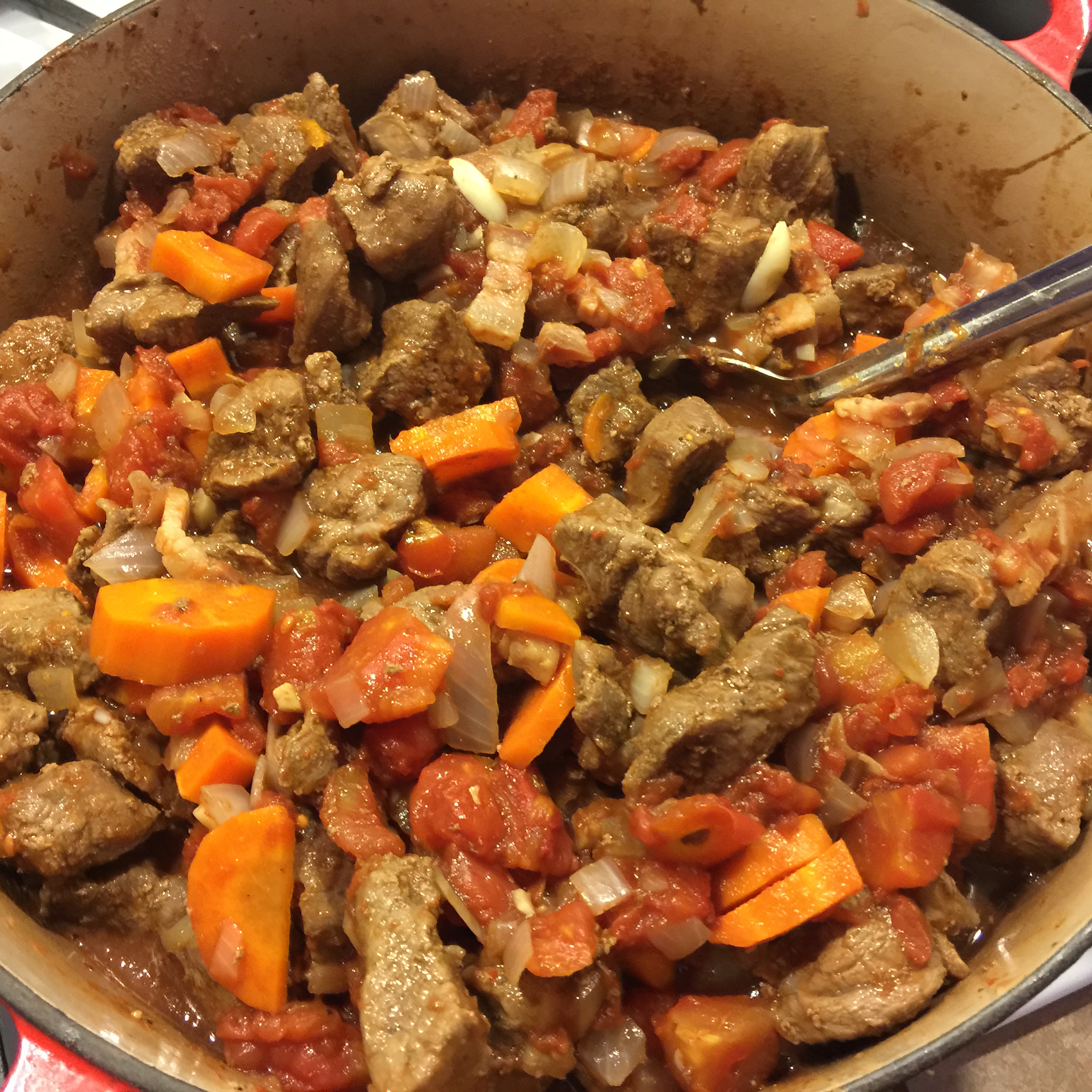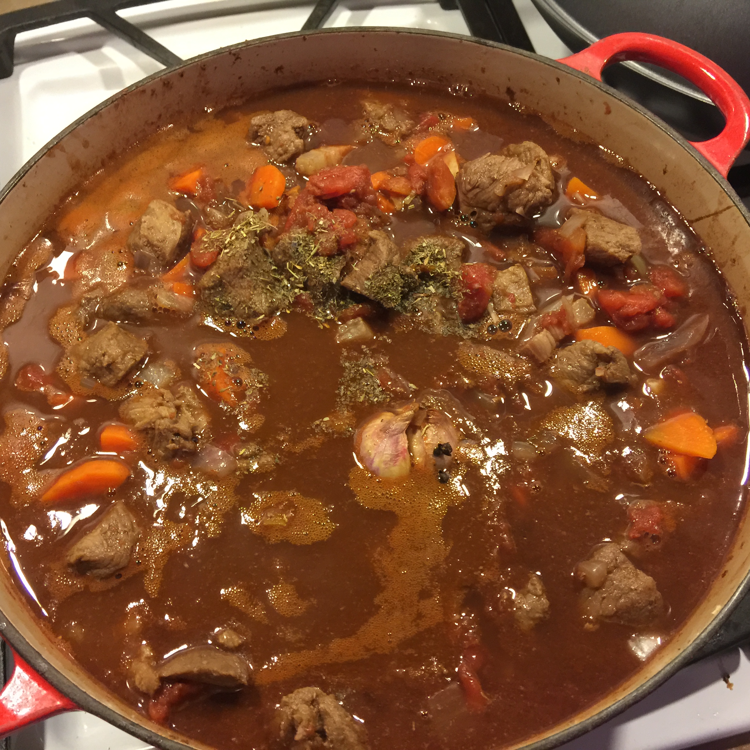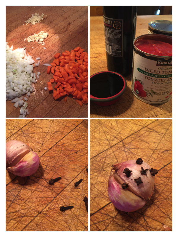 Add the onions and let them sweat for a few minutes ( I always like to let the onions caramelize first on their own in most recipes). Then add the garlic and carrots and let them cook for about 10 minutes. Add the canned tomatoes and bring to boil. Add the vinegar next and boil for 1 minute. Now it is time to add the meat back to the pot with the wine, the herbs and the studded with the cloves.