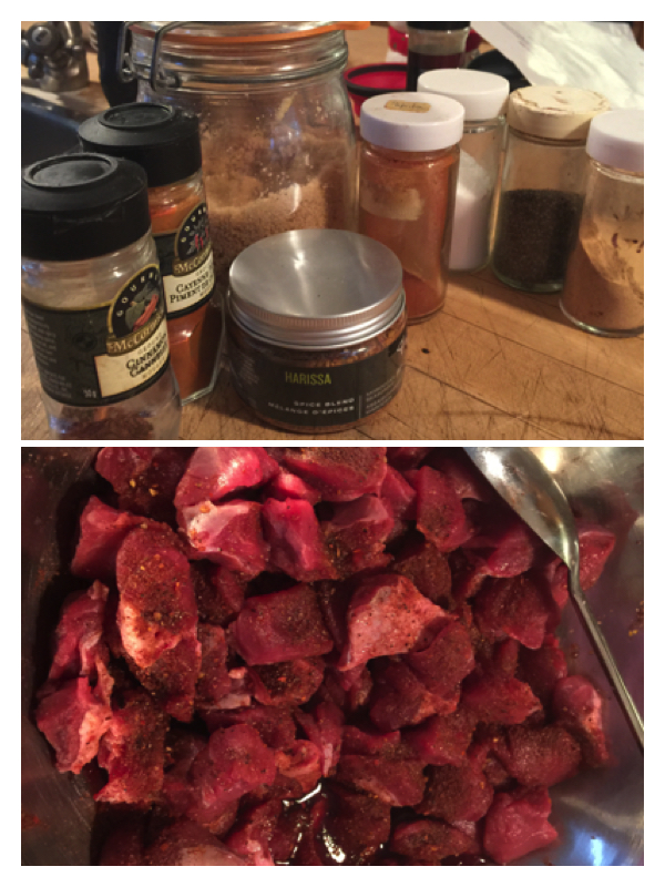 Mix all the marinating spices together and sprinkle on the cubed camel meat. Mix it well and let it sit in the fridge for at least an hour.