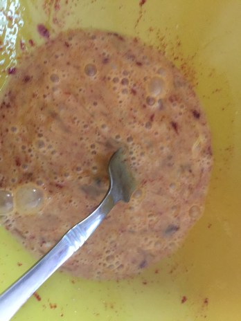 In a large bowl, I whipped 2 eggs and added 1 tbsp paprika, some salt, 1tbsp celery salt, 1 tbsp of chilli powder and 1 tsp of Tabasco sauce. You can season it to your taste.
