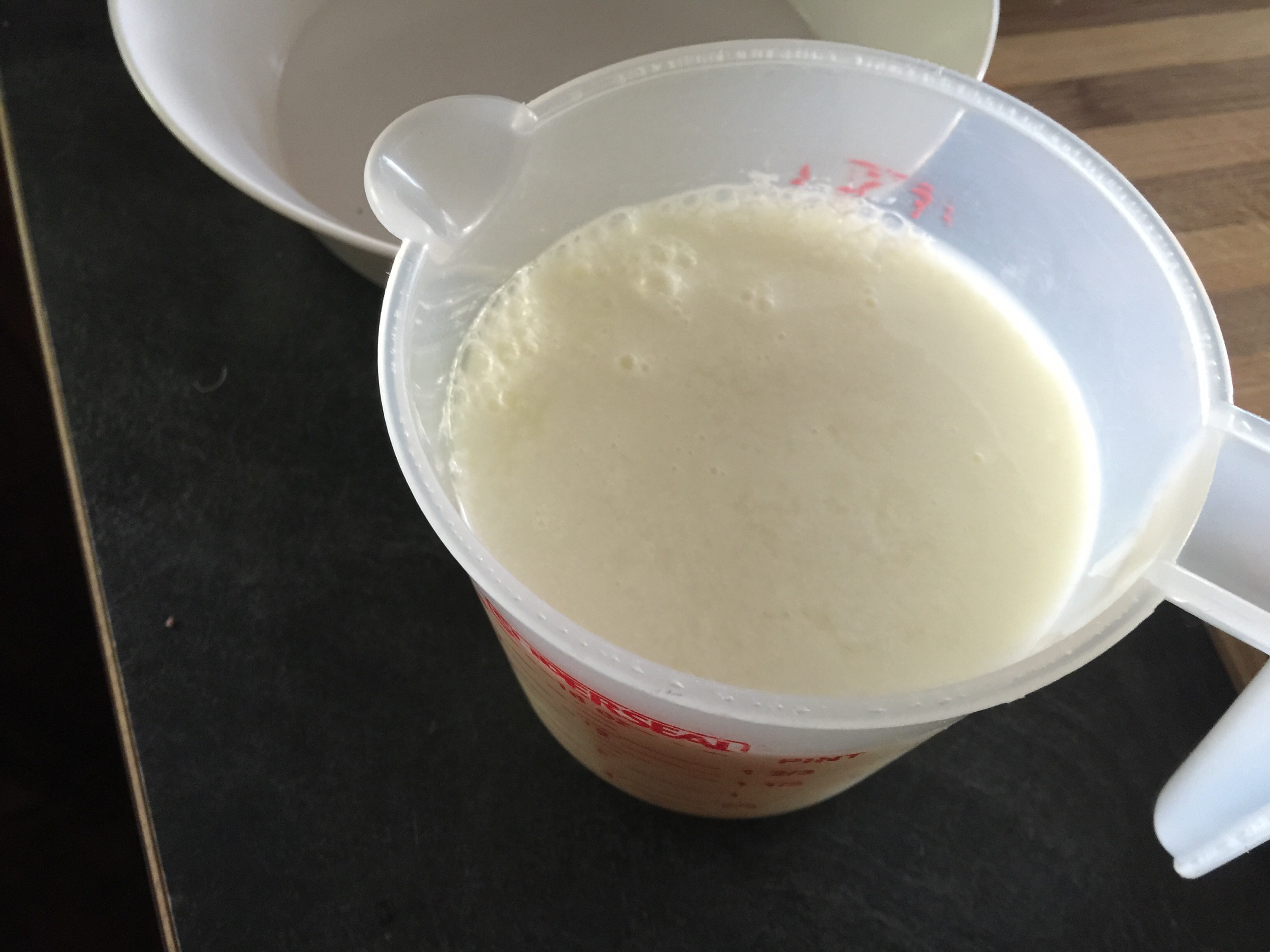 Since we do not have buttermilk on hand, I poured about half an inch of vinegar in a 2-cups measuring cup. I then filled it to the 2 cup line and let it sit.