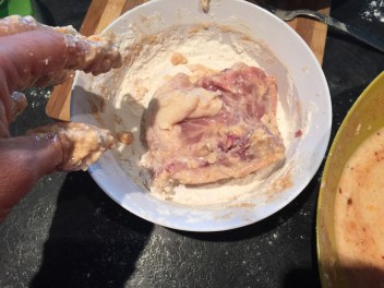 Now roll one piece of chicken in the flour and then submerge it in the buttermilk mixture then back in the flour. Make sure it is covered in flour and set aside in a platter.