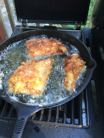 While I was preparing the chicken mixture, Chuck was warming up about 1 inch of oil in a cast iron pan on the side burner of the BBQ.