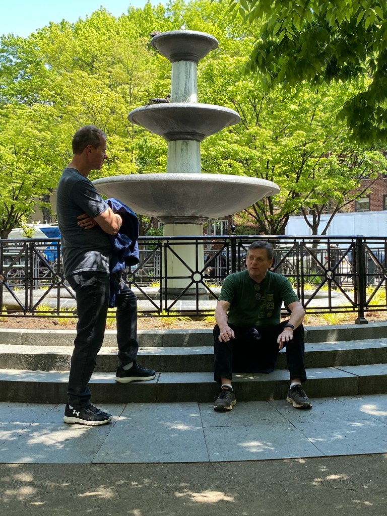 Next we come to a plaza where we wait for Mike to get a typical New York style « pie » / pizza for the group. It is amazing! Simple tomato sauce and the most gooey mozzarella. To die for!