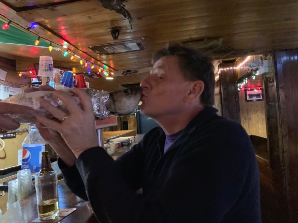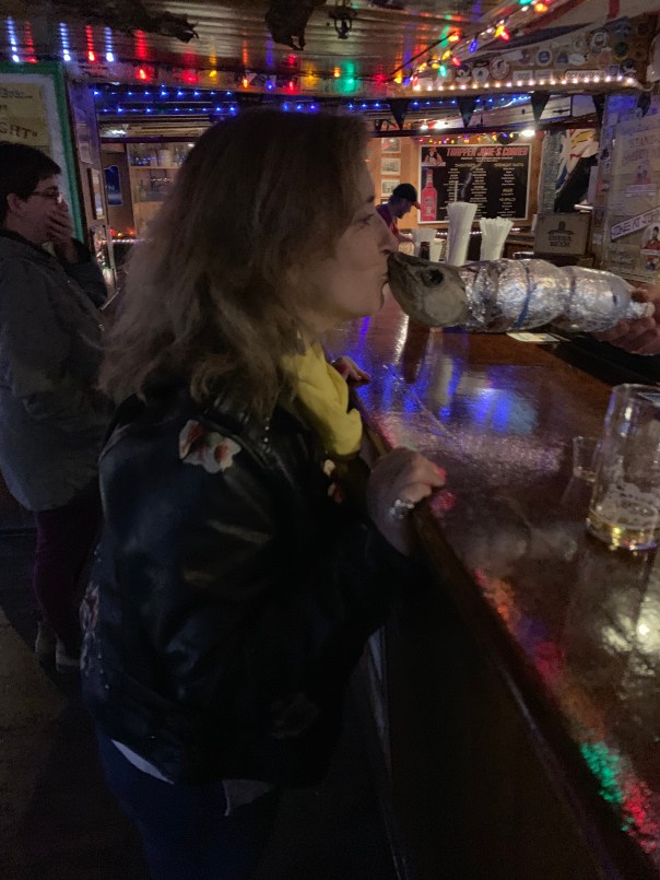 We discover that this involves 4 things. We must eat something from Newfoundland which turns out to be bologna or what is known as a Newfoundland steak. We must have a shot of screech rum. Which is Jamaican rhum bottled here in Newfoundland. We must repeat a local saying about old friend being the support for our sailing forward, very lovely. Then we must kiss the king of Newfoundland which of course is a frozen cod. We perform all these steps to John’s multiple stories and receive our certificate making us honorary Newfoundlanders!