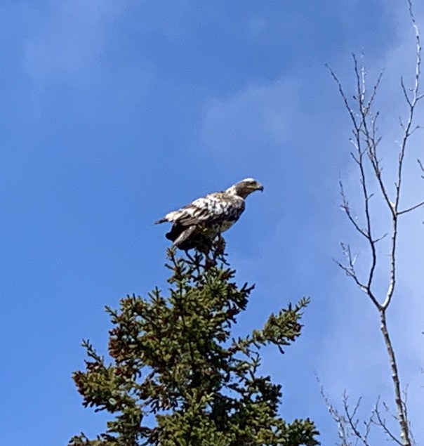 Once at the end of the trail we lookout on some indentations, revealing the location of housing from that time, as well as Boyd’s cove. As we look up, we see a large bird with huge wind span….a juvenile eagle lands at the top of a nearby tree! What a sight!!