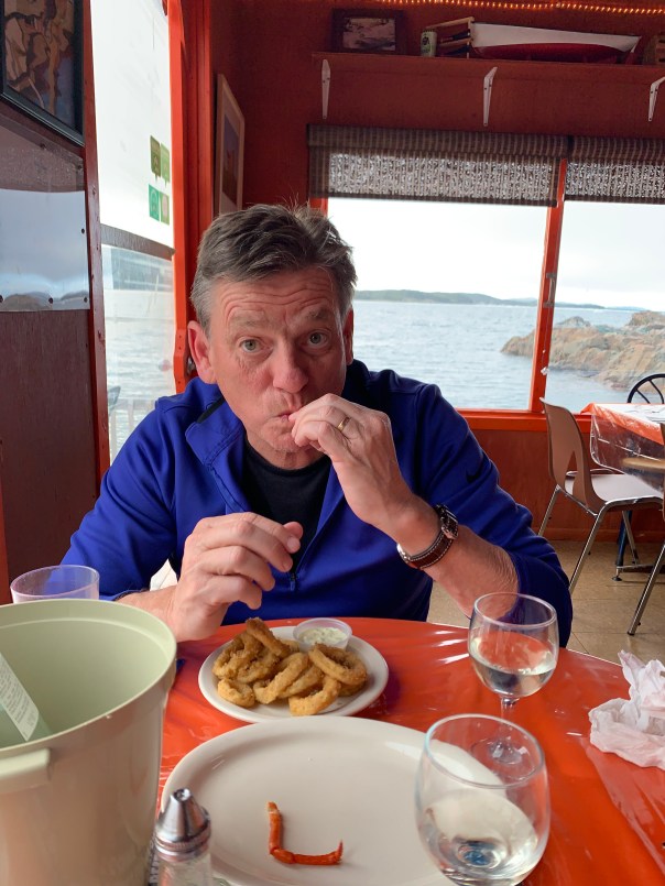 Chuck leftover “squid rings” are fed to the local seagull who rules their patio. She is certainly well fed!