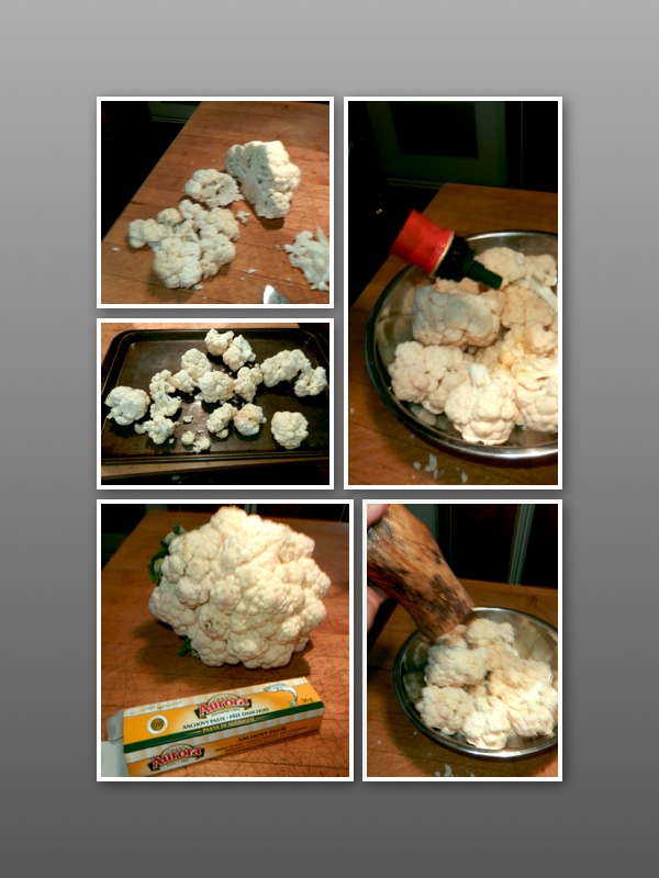 Toss the cauliflower florets with oil as well as salt and pepper to taste and spread on a cookie sheet to roast in the oven at 425F for 10-15 minutes.