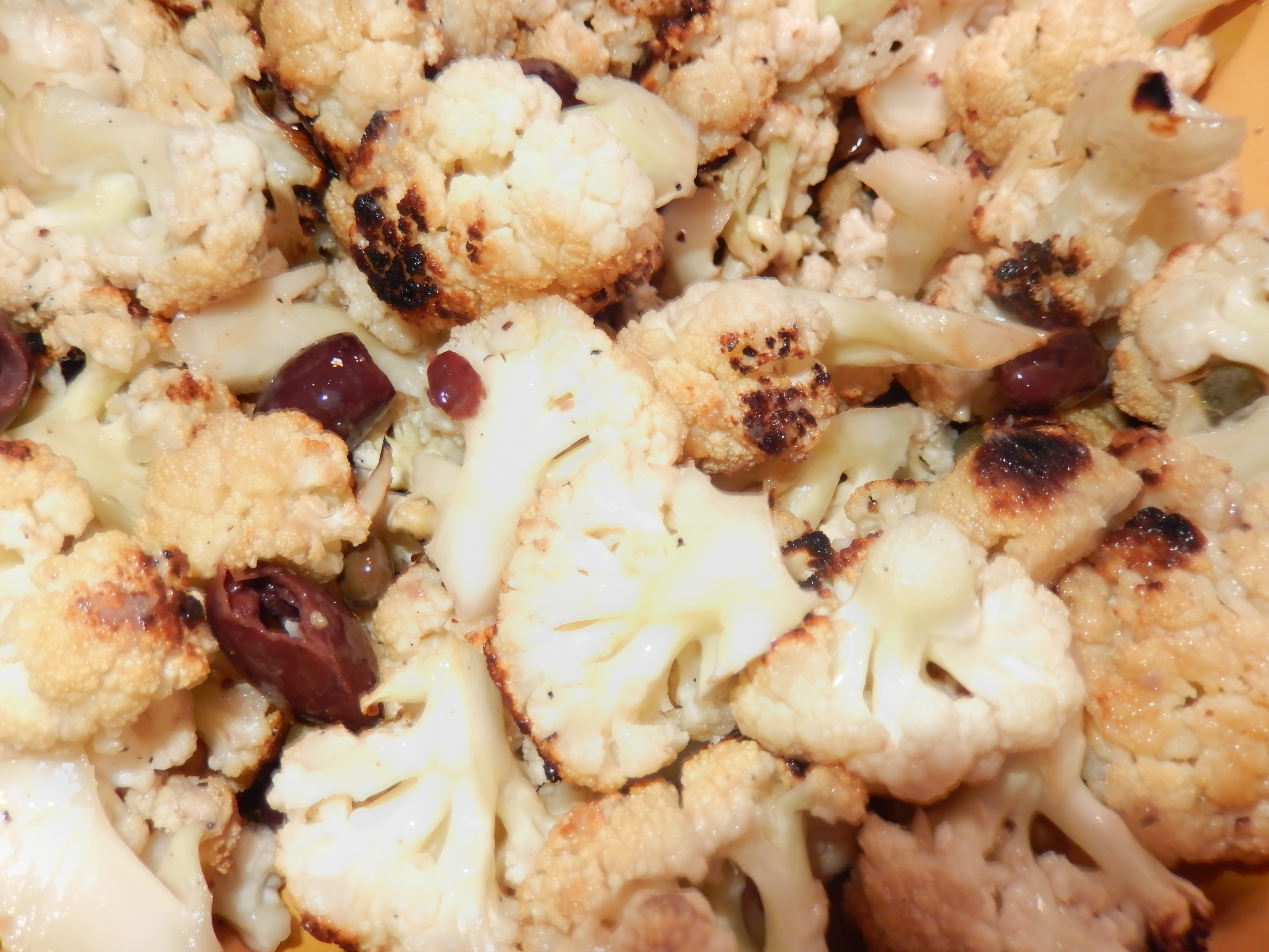 Cut the florets in bite sizes, place in a pretty bowl and add 2 tbsp of capers, 1/2 cup of kalamata olive pitted (buy them already pitted, much easier) and the olive oil mixture.