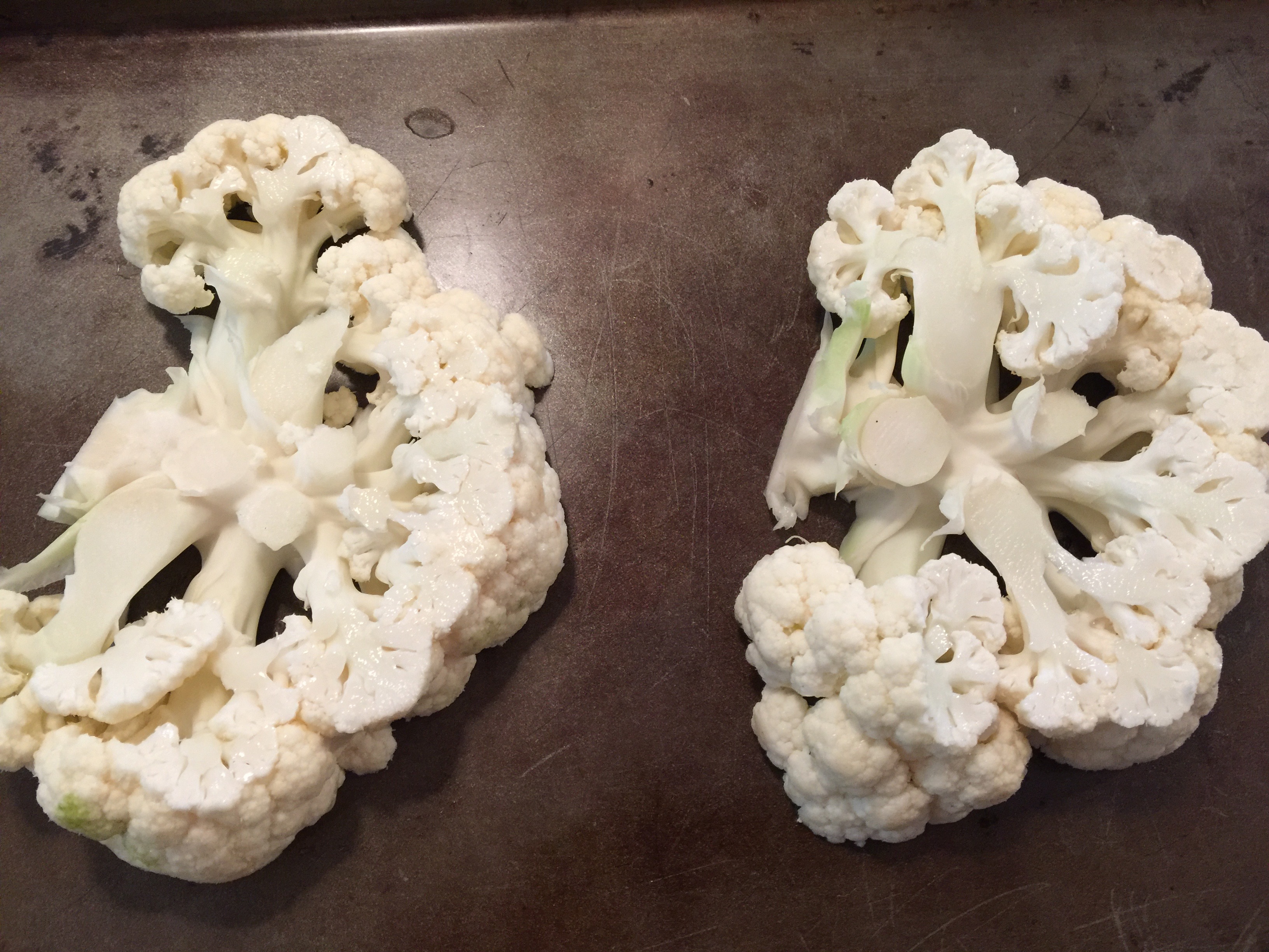Cut a cauliflower right in the middle and then cut 2 to 3 1-inch thick slices depending on the size of your cauliflower. Spread generously with parsley pesto on the side facing up.