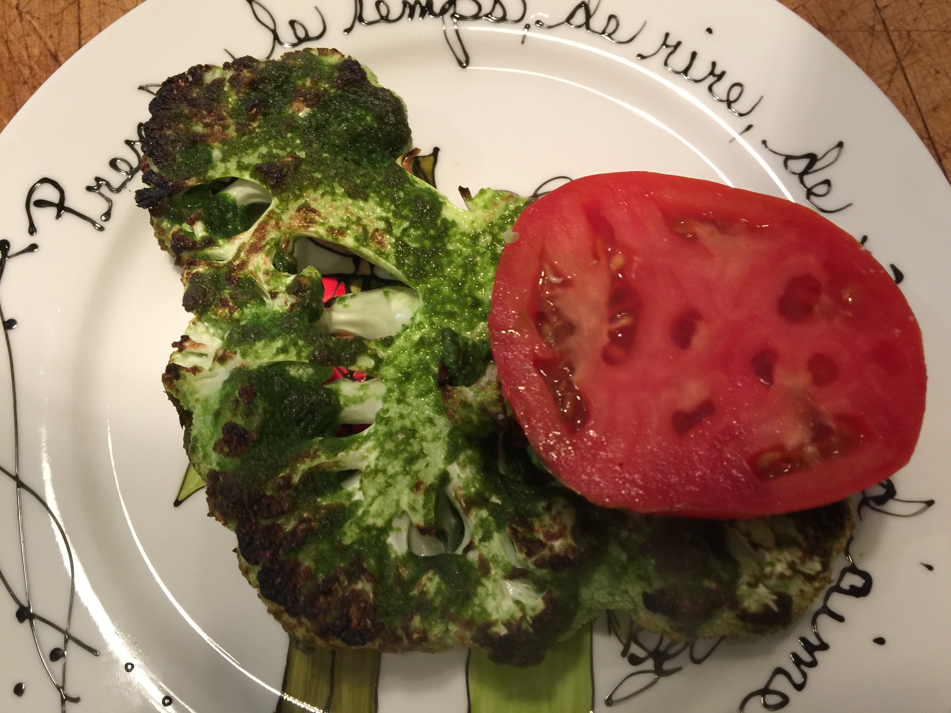Place the cauliflower slices in the oven at broil (setting high) about 6 inches from the element. Roast for about 3-5 minutes, checking often. Once it is browning, turn them over and brush with pesto on the other side. Place under the broiler for another 3-5 minutes (or however long it takes to brown in your oven).