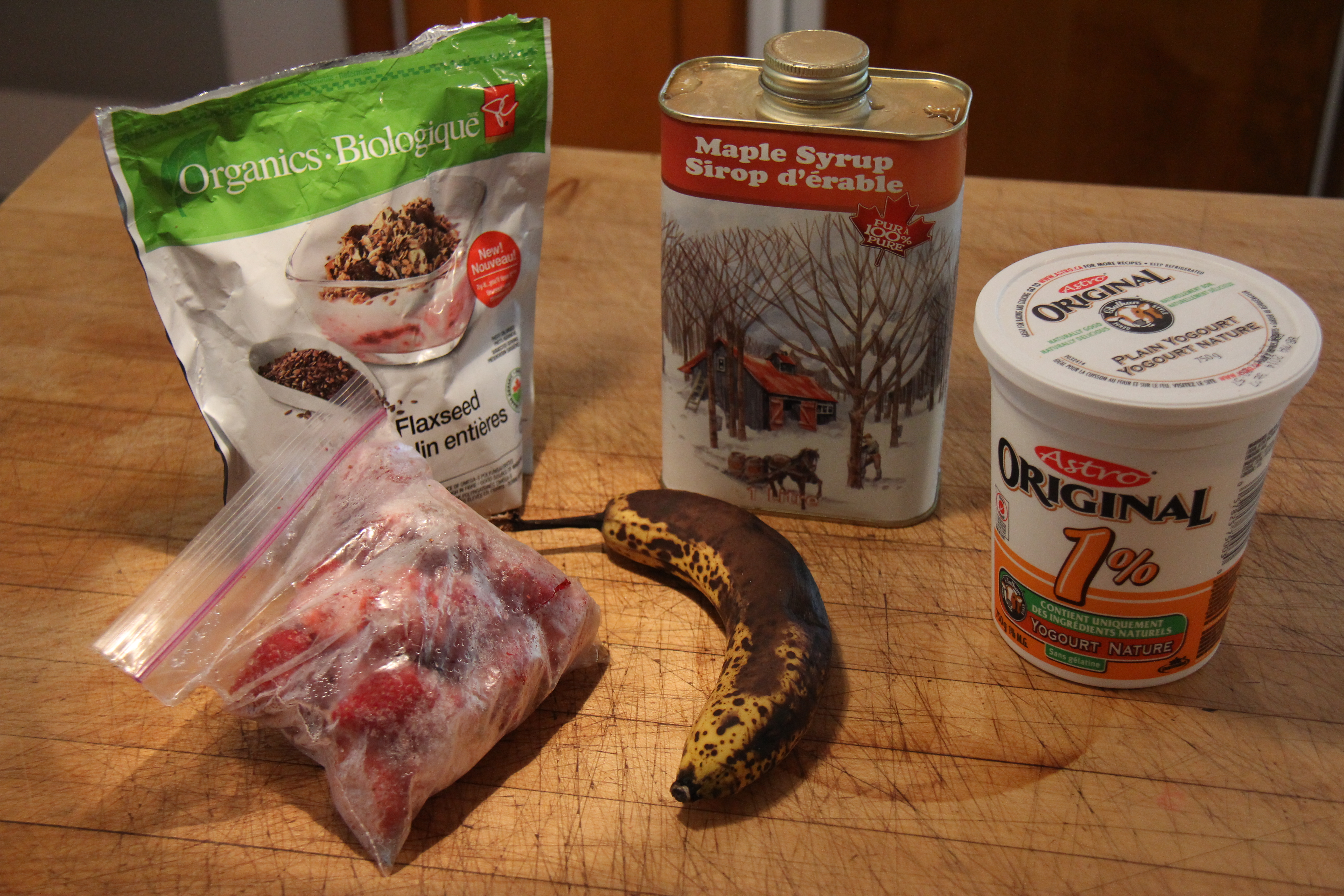 - Put all ingredients in a blender. I usually put the yogourt last to make sure the fruits get well pureed.