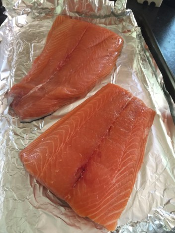 Place the salmon fillet meat side up in a container or aluminum foil and spread the marinade on the salmon. Put in the refrigerator for 1-2 hour.