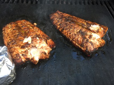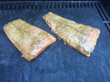 Once the bundle of asparagus is ready, the BBQ should be hot. Place the salmon filet on the grill.