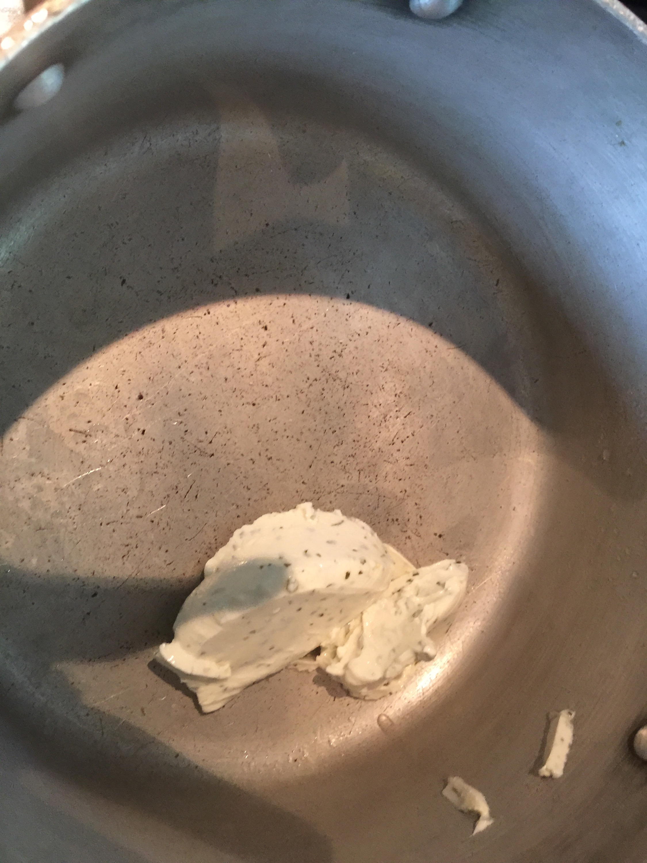 Put about half the container of light Philadelphia herb and garlic cream cheese with about 2 tbsp of lemon juice in a saucepan.