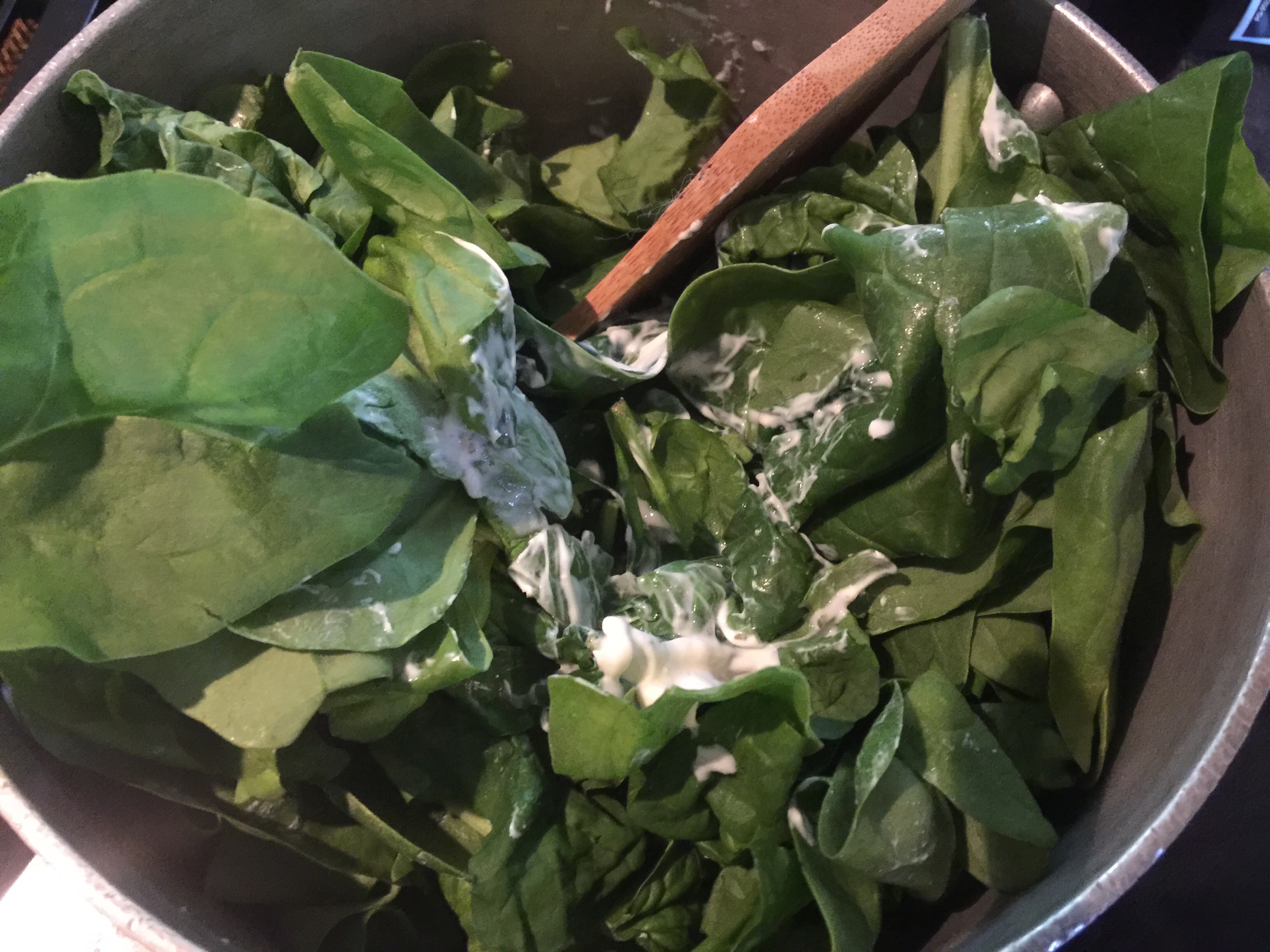 Heat at medium on the stove until cheese is melted and add a whole package of spinach. Heat for about 2 minutes, turn the burner off and leave the cover on to finish cooking.