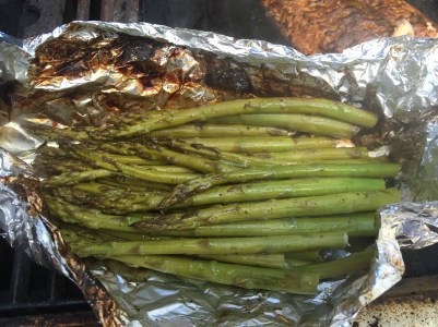 While you wait for the BBQ to heat up, break off the end of a bunch of asparagus and place in aluminum foil.
