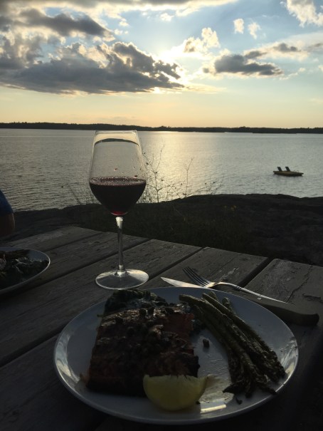 Tonight’s special at the Rock on Sparrow Lake, Muskoka was salmon. I prepared dinner in under 20 minutes while hubby was reading his newspaper on the couch in the Muskoka room….Life At The Cottage!