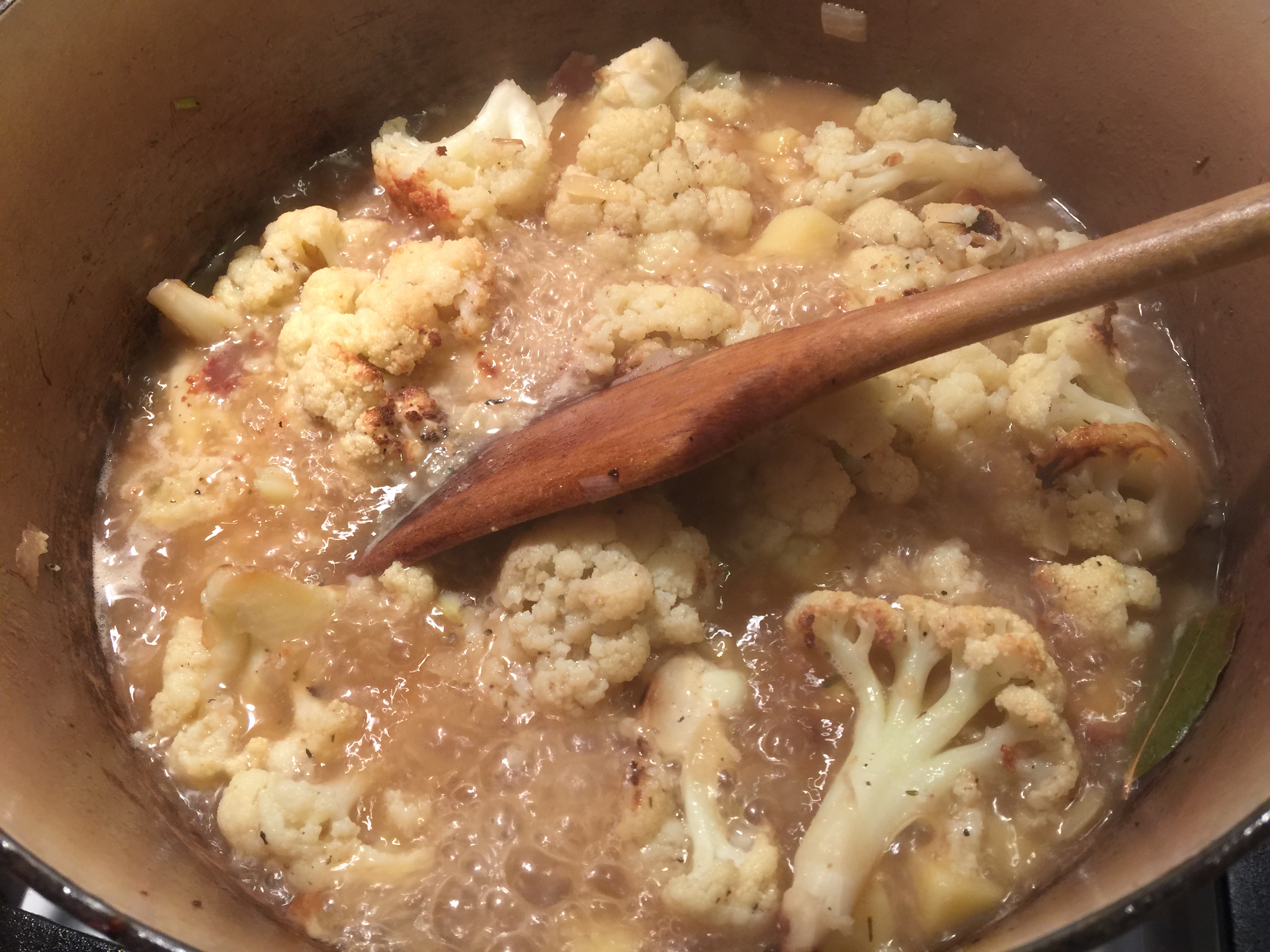 Add the cauliflower and the stock (I used my homemade stock from the freezer which I freeze in bags of 4 cups). Bring to boil and cook for 10-15 minutes.