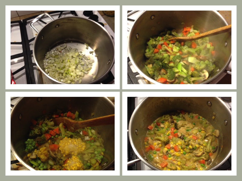 In a separate pot, melt some butter, add the onions and stir until translucent. Add all the other vegetables and stir every now and again until they are soft. Add the turkey and pour the Bechamel sauce on top. Stir everything together and heat through.